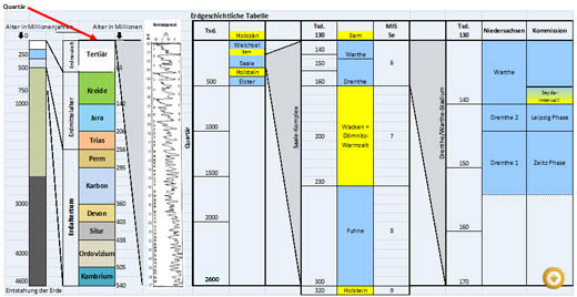 Diese Tabelle zeigt eine zeitmaßstäbliche Einteilung, wobei zu erkennen ist, dass das Quartär tatsächlich einen kurzen Zeitraum innerhalb der Erdexistenz ausmacht; ebenso stellt man fest, dass der Saale-Komplex nur 8% der Zeit des Quartär ausfüllt und die Drenthe-Zeit, in dem die Brelinger Berge entstanden sind, innerhalb des Saale-Komplexes auch nur einen kleinen Zeitraum einnimmt, nämlich gerade mal 12%. Erschwerend für die Nomenklatur des Drenthe/Warthe Zeitraums sind die in dieser Hinsicht unterschiedlichen Auffassungen der Geologen der verschiedenen Bundesländer Norddeutschlands. Selbst die Geologischen Landesämter von Hamburg, Schleswig-Holstein und Brandenburg vertreten aufgrund anderer Befunde unterschiedliche Abfolgen von Ereignissen.