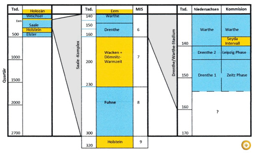 Aus der Sauerstoff-Isotopen-Stadien-Kurve, die den gesamten Zeitraum des Quartär abdeckt, lassen die sich wiederholenden Vereisungen gut erkennen. Um die Saale-Eiszeit, als Teil des Quartär, besser sichtbar zu machen, ist sie in nachfolgender Tabelle gesondert dargestellt.
