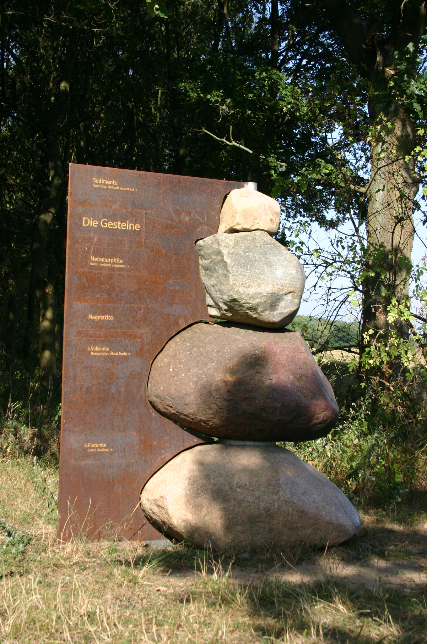 Zwei Steine aus dem Findlingsstapel werden im folgenden exemplarisch beschrieben: Der im Findlingsstapel verwendete Quarzporphyr kann als Repräsentant der Ergußgesteine (Vulkanite) innerhalb der Gruppe der Magmatite wie folgt beschrieben werden: