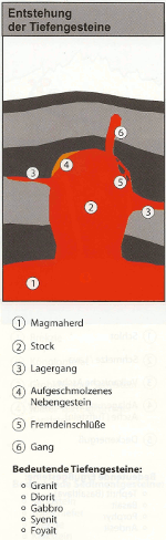 extrem lange Zeiträume erstreckende Erstarrung bedingt die typische fein- bis grobkörnige ausgeprägte Gefügestruktur.ln Abhängigkeit des Kieselsäuregehaltes werden die Tiefengesteine