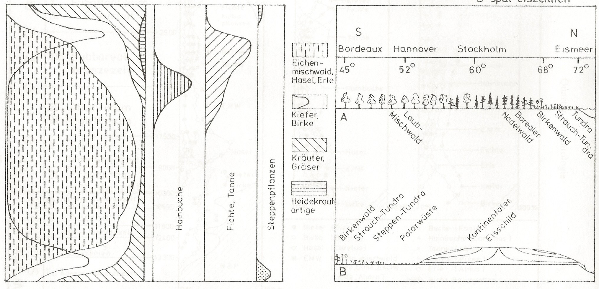 Schema der Florenentwicklung eines Glazial - Interglazial - Zyklus (links: zeitliche Aufeinanderfolge der Florenelemente; rechts: rämliche Gliederung der Vegetationsgürtel).