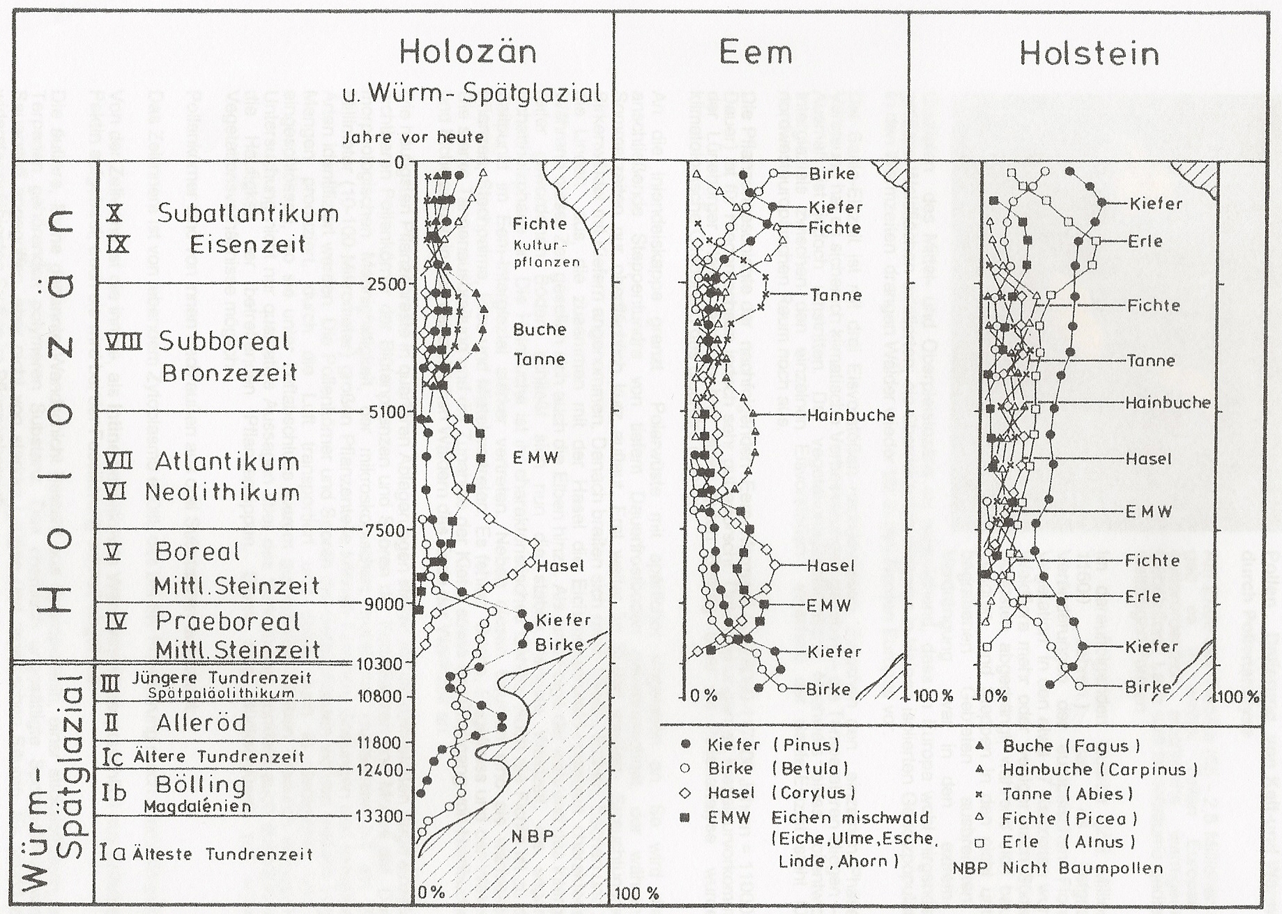 Holozän, Eem, Holstein. Schematische Darstellung der Vegetationsentwicklung. I bis X Zeitstufen der Vegetationsentwicklung nach Fibras(1949). Archäologische Stufen nach Müller - Beck(1983). Holzän nach Frenzel(1983), Eem. Typ Zeifen nach Jung, Beug und Dehm(1972) , Holstein, Wiechel und Hetendorf nach Hallik (1960) und Meyer(1974)).