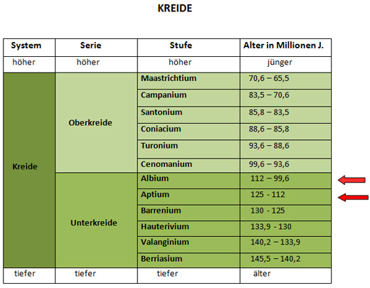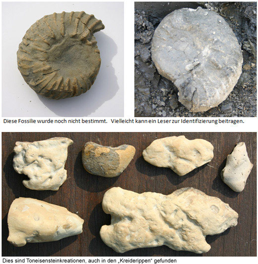 Die Fossilien stammen aus den verschiedenen Stufen der Kreidezeit, vorwiegend aus dem Alb. Bruchstücke von Muscheln (Inoceramen) sind häufig zu finden, aber auch vollständig erhaltene 10cm große Ammoniten (Kopffüßler), wie unten im Bild zu sehen.