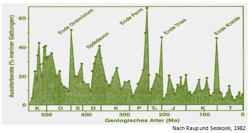 Ein Blick weit zurück in die erdgeschichtliche Vergangenheit zeigt, dass es zu verschiedenen Zeiten immer wieder zu Massenaussterben kam.