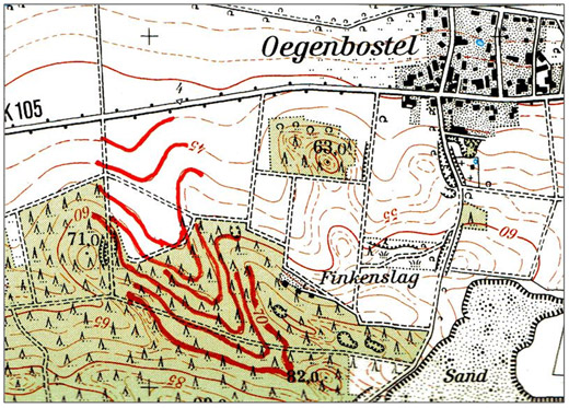 Als die in den Brelinger Bergen bis 300m dicken Inlandeis-Gletscher abschmolzen wurden Sande und Kiese von seinen Schmelzwässern fortgespült und formten besonders an der Nordseite steilabfallende kleine Täler. Im oberen Bereich haben sie bis zu 15% Gefälle d.h. auf 100m war ein Höhenunterschied von 15m entstanden. Auf der Topographischen Karte 1:25000 Nr.3424 Mellendorf ist gut zu erkennen, dass die Talsohle, die dem Dorf Oegenbostel westlich am nächsten liegt, auf 1000m Länge von 40 auf 80m Höhe steigt. Siehe auch Kartenausschnitt.