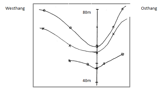 Diese Zeichnung zeigt den flacheren Westhang und den steileren Osthang an drei verschiedenen Stellen des Tales.